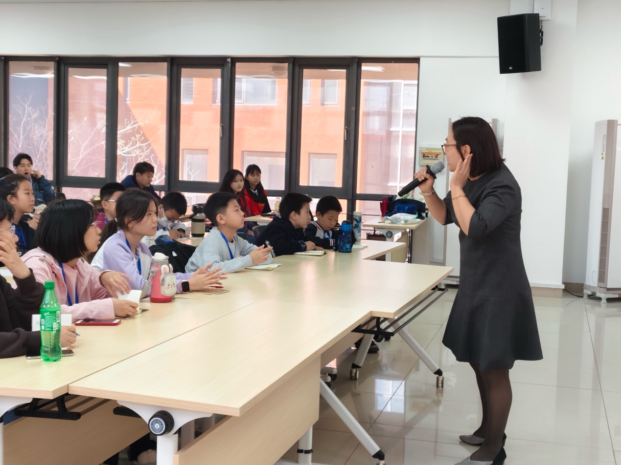 学科竞赛中心主任田丽老师带来的“英语演讲大咖分享会”。田丽老师先是以自己第一次演讲发生的有趣故事活跃气氛,接着带入主题,凭借丰富的教学和指导竞赛的经验和深厚的专业知识,以幽默风趣的方式,从如何克服演讲时遇到的困难、怎么理解演讲的沟通和传播概念以及怎样讲好自己的故事吸引观众三个方面展开,最后鼓励小记者们“让世界倾听你们的声音”。
